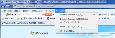 IEの画面を開いて、「ヘルプ」をクリックした後に、「バージョン情報」をクリック。
