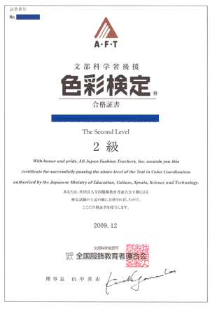 11月受験で、昨年末近くに合否発表のあったAFT「色彩検定」の合格証書でした☆